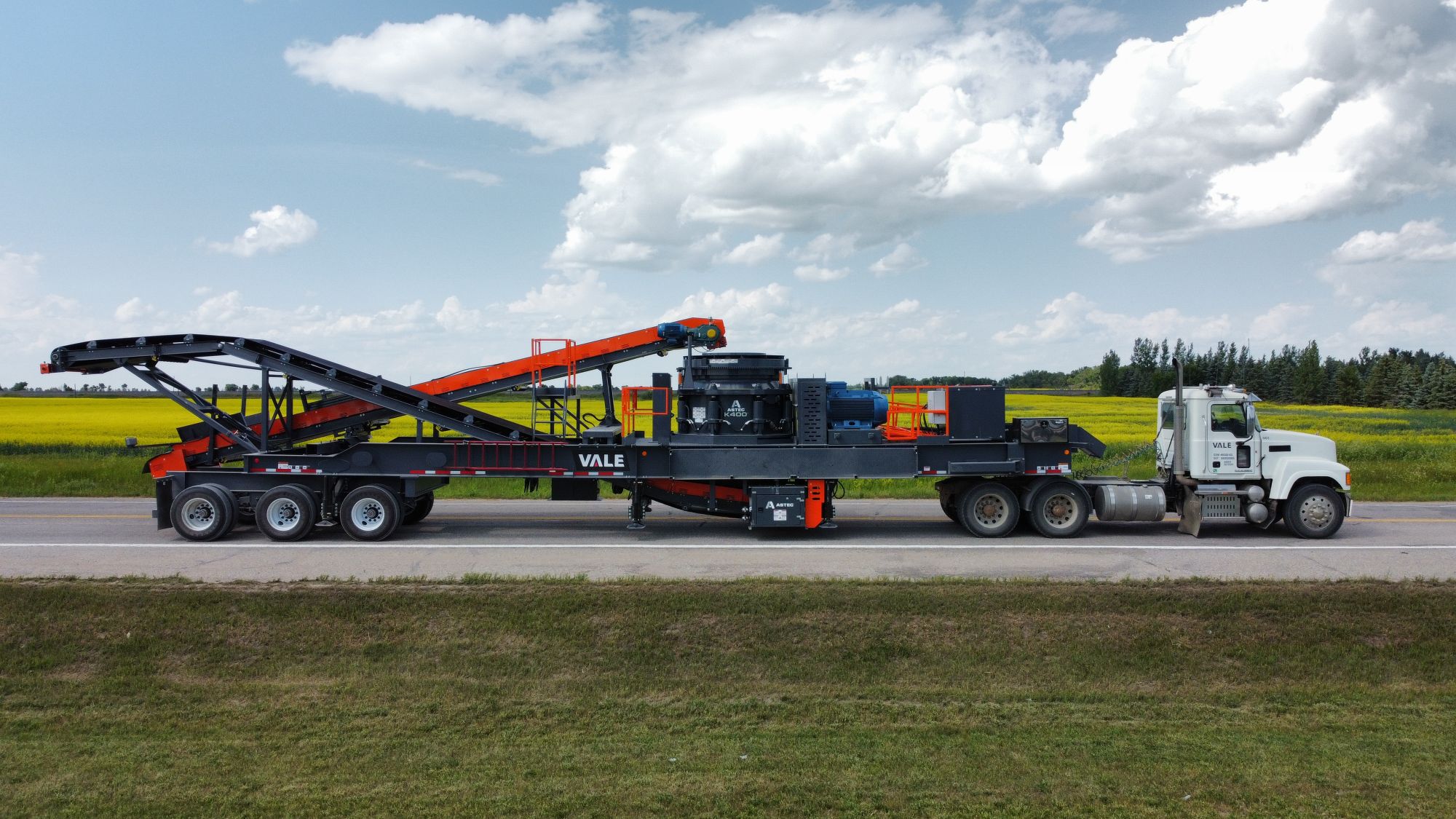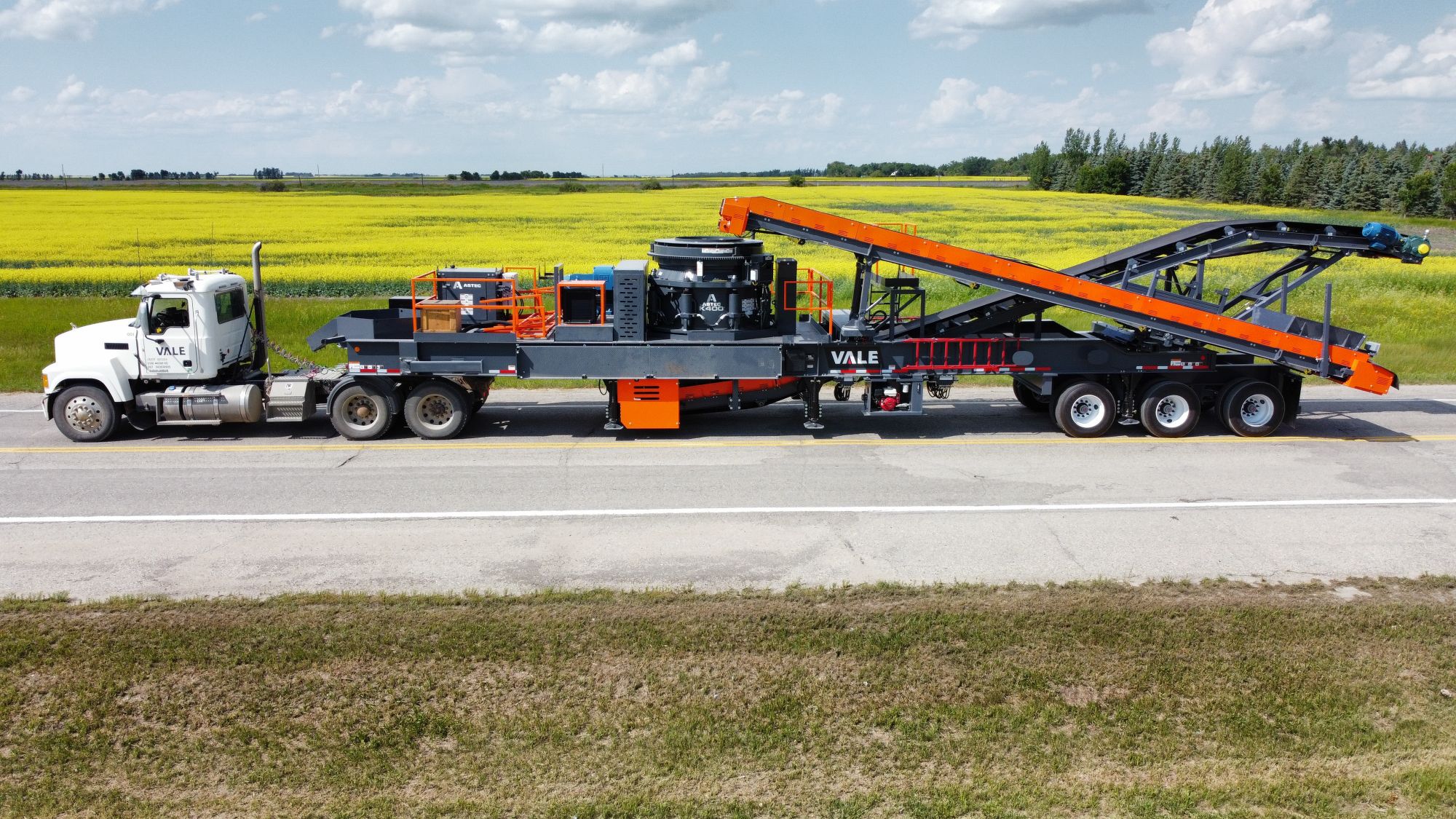42″ x 44′ Rear Discharge (Out) conveyors, 3-ply vulcanized belt with heavy-duty rock box transition from under-cone to conveyor