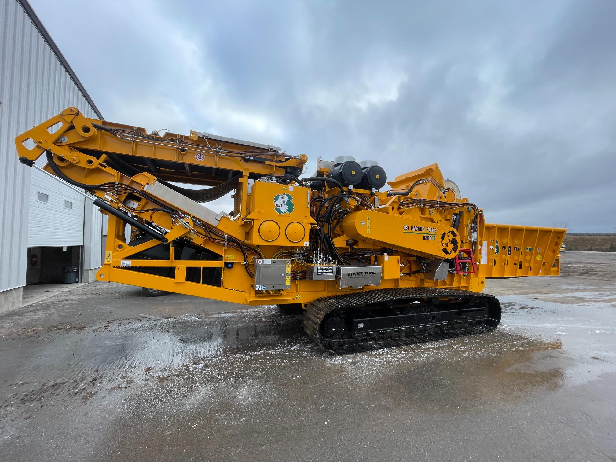 The CBI 6800 features a high torque, hydrostatic feed system; PT Tech hydraulic clutch; and a choice of two CAT power plants. The 4” thick, high strength rotor core is shear pin protected. The entire system is controlled by IntelliGrind logic that incorporates feed speed that varies automatically with engine load, and an optional modem communications system that provides for real-time system diagnostics, analysis, and operating program adjustments allowing the operator to optimize performance while avoiding costly downtime. All this in a package that weighs between 82 – 89,000 pounds making it legally transportable on a standard lowboy! Available in portable, stationary, or track-mounted versions.
